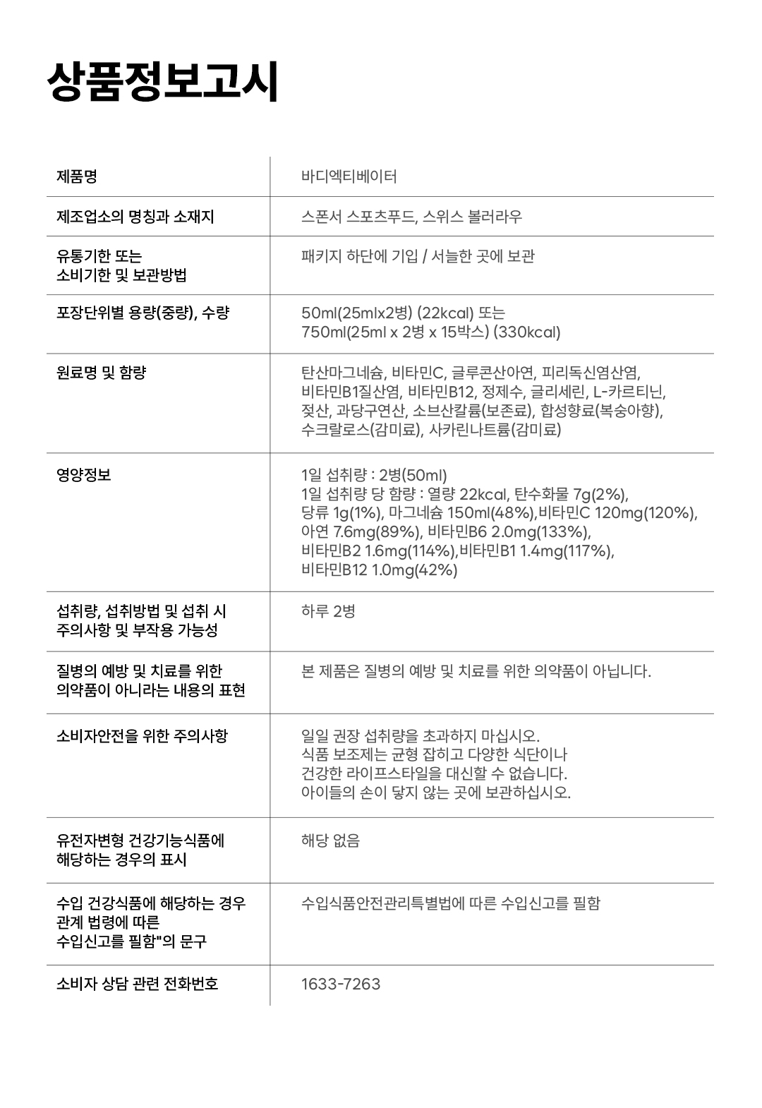 50ml (25mlx2병) (22 kcal) 또는 750ml(25mlx2병x15박스) (330 kcal)