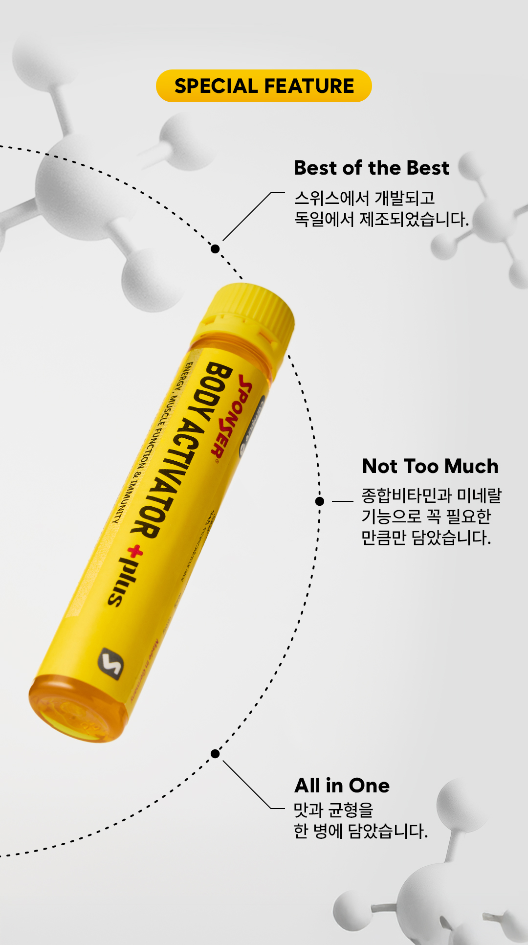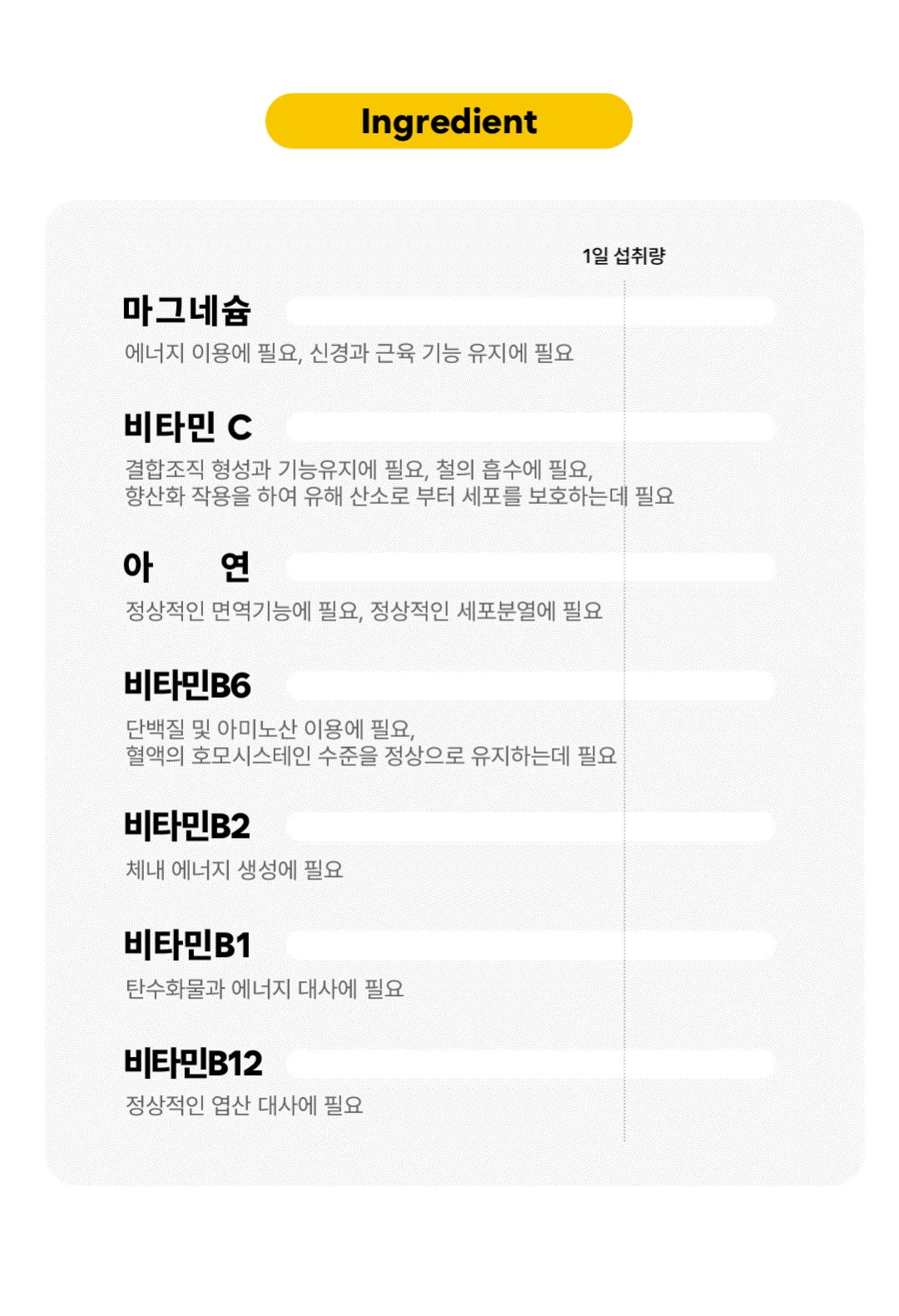 (마그네슘) 에너지 이용에 필요, 신경과 근육 기능 유지에 필요 (비타민C) 결합조직 형성과 기능유지에 필요, 철의 흡수에 필요, 항산화 작용을 하여유해산소로부터 세포를 보호하는데 필요 (아연) 정상적인 면역기능에 필요, 정상적인 세포분열에 필요 (비타민B6) 단백질 및 아미노산 이용에 필요, 혈액의 호모시스테인 수준을 정상으로 유지하는데 필요 (비타민B2) 체내 에너지 생성에 필요 (비타민B1) 탄수화물과 에너지 대사에 필요 (비타민B12) 정상적인 엽산 대사에 필요